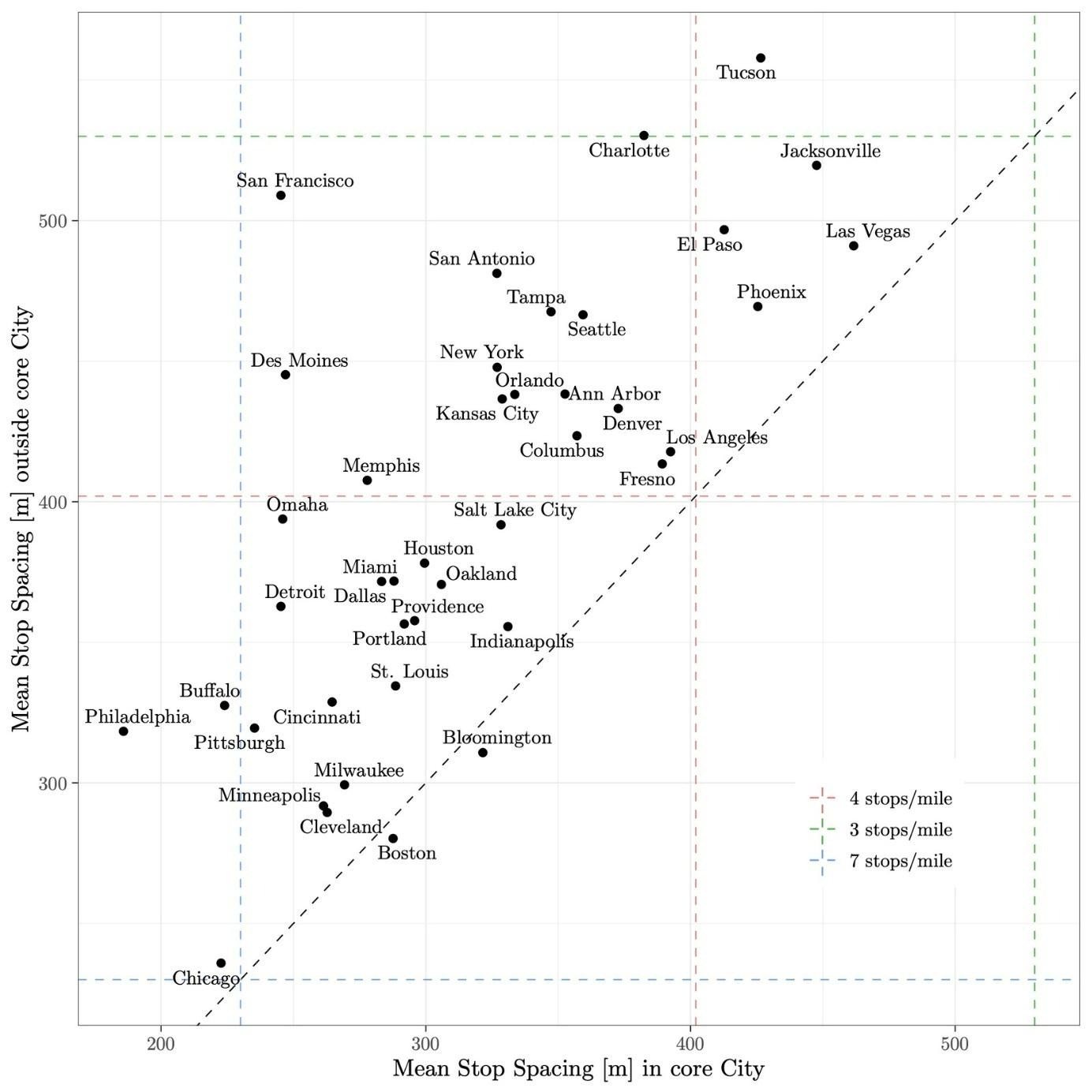 Another example is the CTA’s spacing of bus stops. Today, bus stops are comically close together – often at almost every block, in violation of transit best practices, and far more densely spaced than other US cities. Transit agencies consistently describe bus stop consolidation as the most successful action they can take to speed up bus service, which reduces costs (because it takes fewer operator hours to run a route), and improves travel times.