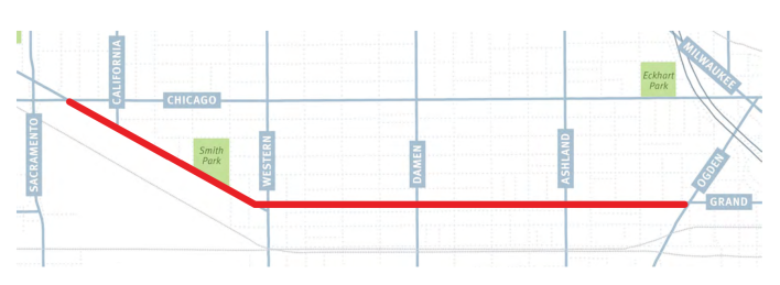 Also at this meeting, Roger Romanelli, the car activist who helped kill the Ashland Avenue bus rapid transit proposal, and West Town residents protested plans for a four-to-three “road diet” with protected bike lanes on Grand Avenue. Their “Not In My Back Yard” argument asserted that this street remix, between Damen and Ogden Avenues, would impede bus service, although that’s almost certainly not the case – more on that in a bit.