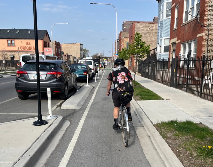 The department is currently getting ready to extend the Complete Streets makeover from Damen to Ogden, about a mile. The plan for the new section includes the road diet with concrete-protected bike lanes, plus amenities for pedestrians and transit riders.