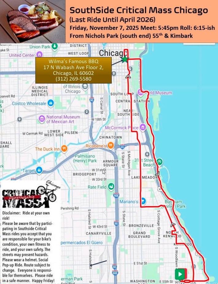 "It was a nice end to the season," longtime SSCM rider Danielle McKinnie told Streetsblog. "It was good to support a Black-owned business, and we appreciated Wilma's hosting us, and enjoyed their delicious food. It was a great way to end the season before SouthSide Critical Mass reconvenes on April 3.