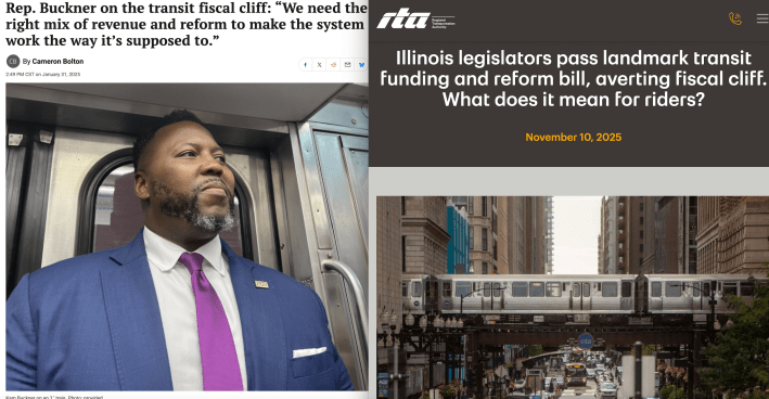There was more of the same in Mishra's other Illinois Policy post last week, "Transit fares frozen as Chicago drivers hit with 45-cent toll hikes" the researcher gripes, "Some of the hikes lawmakers rushed through on Oct. 31 were not even necessary to close RTA’s budget gaps." Well, yes, the idea behind the $1.5 billion in annual state funding was not just to preserve the less-than-satisfactory status quo but improve service and avoid future fiscal cliffs.