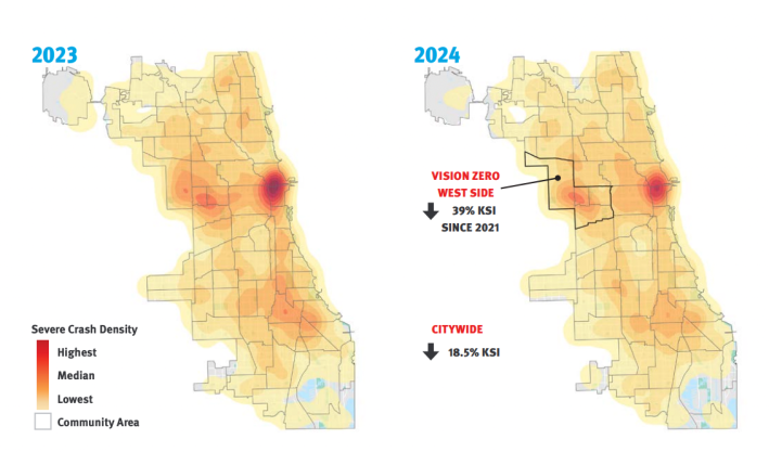 Citywide, there was a 18.5 percent decrease in people killed or seriously injured during this period. But in Austin, West Garfield Park, East Garfield Park, and North Lawndale, there was a 39 percent reduction. Pedestrian and bike fatalities dropping by 69 percent in these communities.