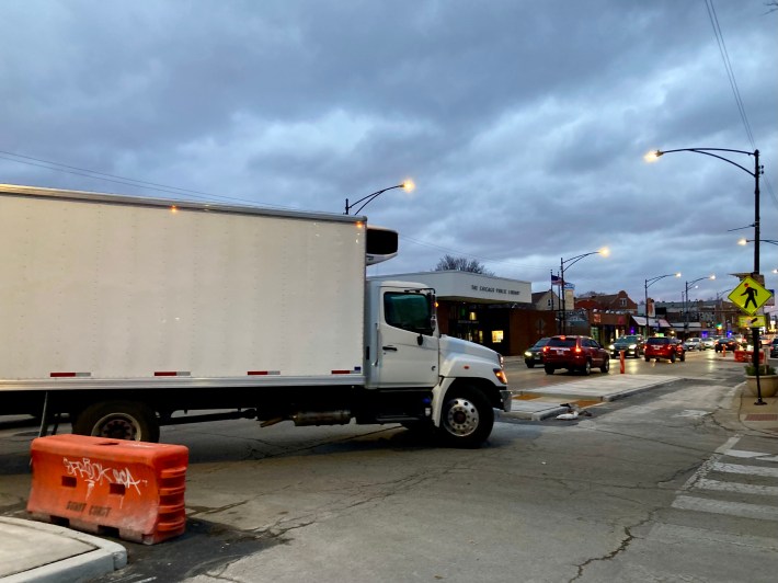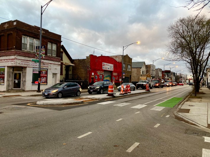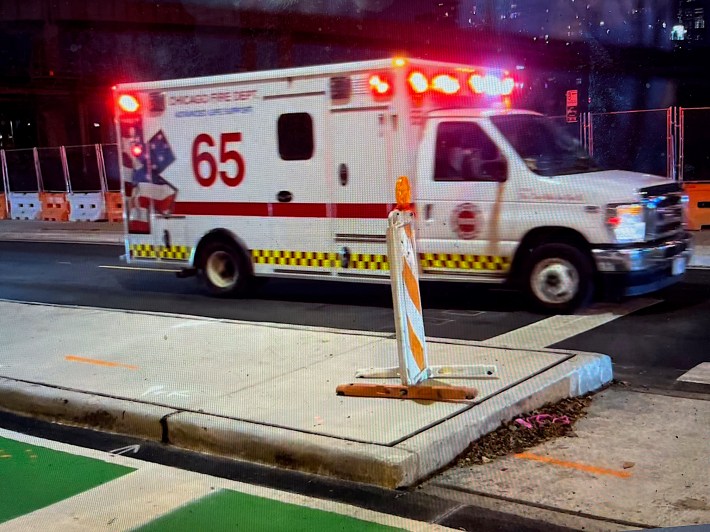 Recent construction of the project has faced a backlash from some Facebook users, and in the form of a change.org petition featuring an AI-generated image of the corridor. The fact the visual is ersatz is obvious from the gibberish painted on the hood of an imaginary ambulance, depicted as being obstructed by a traffic jam. However, actual Chicago first responders have told Streetsblog that Complete Streets designs aren’t actually causing delays for emergency vehicle drivers.