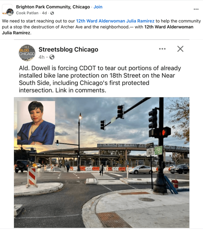 A post on the Brighton Park Community Facebook discussion group even shared a screenshot of SBC’s recent article about Ald. Pat Dowell forcing CDOT to tear out bikeway protection on 18th Street on the Near South Side. Notably, the original poster didn’t link to the actual piece, which explains why the 18th project is a good idea, and Dowell’s actions showcase the downside of aldermanic prerogative. On the contrary, the OP argued that Ramirez should kill the Archer project as well.