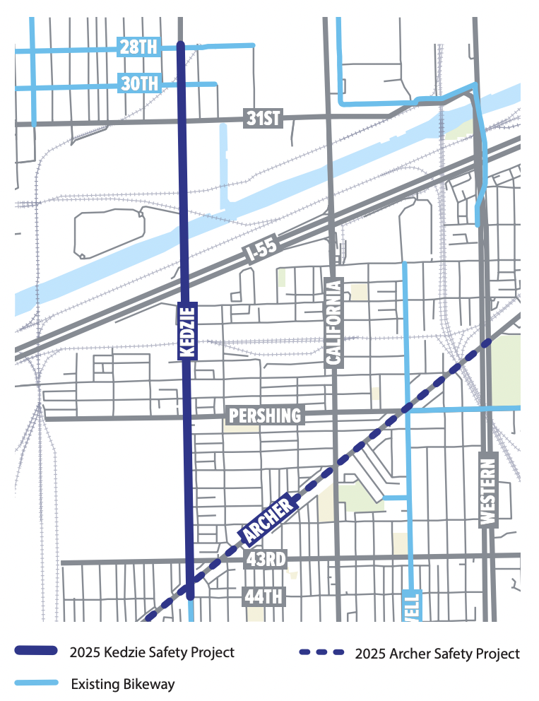 The initiatives includes a 1.9 mile stretch of Kedzie (3200 W.) between Archer (about 4330 S. here) and 28th Street. The Archer segment goes 1.9 miles between 47th Street (Archer is about 3600 W. here) and Western Avenue (2400 W., Archer is about 3730 S. here). The project includes a 4-to-3 road diet and slip lane removals on Archer, protected bike lanes, pedestrian upgrades, and bus boarding islands.