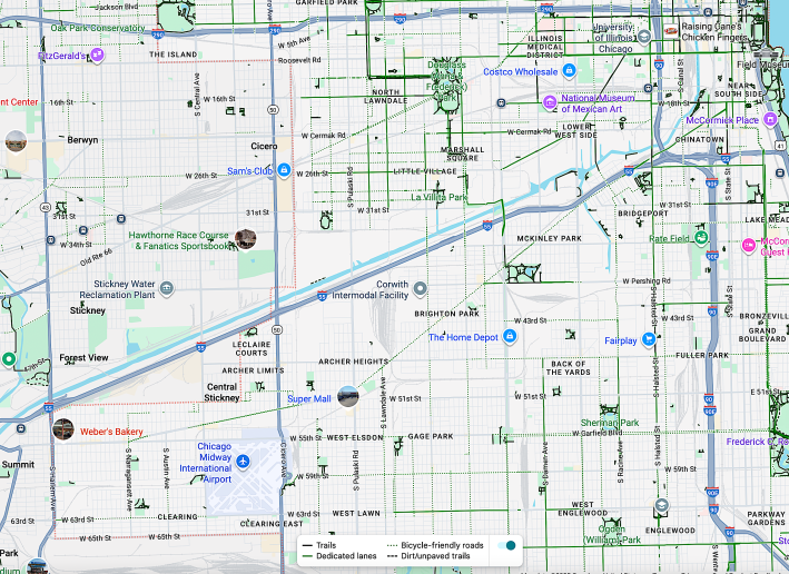 Extending the new protected bike lanes bike lanes on Archer further east of Western towards Chinatown will be challenging. That segment is under Illinois Department of Transportation jurisdiction, which adds bureaucratic barriers. The existing bikeway on Pershing Road (3900 S.) and park pathways in McKinley Park were suggested for east-west travel.