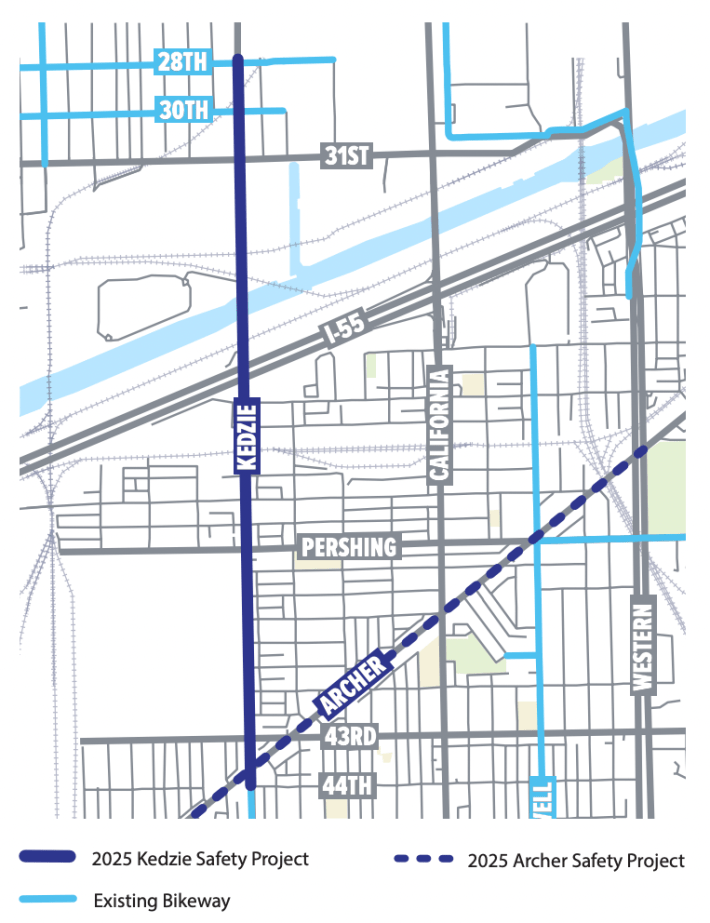 The initiatives includes a 1.6 mile stretch of Kedzie (3200 W.) between Archer (about 4330 S. here) and 31st Street. The Archer segment goes 1.9 miles between 47th Street (Archer is about 3600 W. here) and Western Avenue (2400 W., Archer is about 3730 S. here). The project includes a 4-to-3 road diet and slip lane removals on Archer, protected bike lanes, pedestrian upgrades, and bus boarding islands.