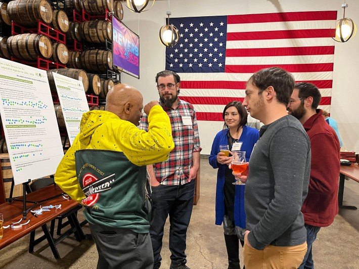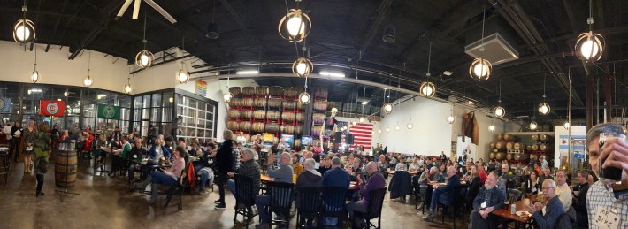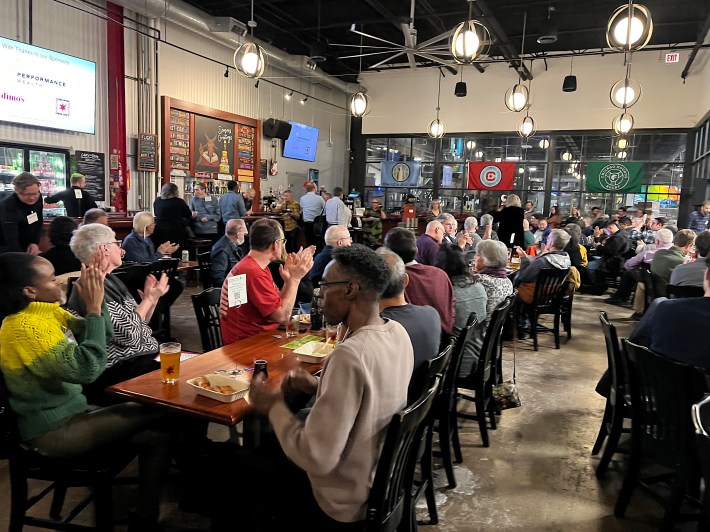 The gathering took place at Revolution Brewing's Avondale taproom, 3340 N. Kedzie Ave., which is easy to access from the Blue Line. This year, the mood was particularly cheerful. That's because the event was only about a month after public transportation boosters helped pass a robust transit reform/funding bill in the wee hours of October 31, aka the Halloween Miracle. At least a hundred people happily chatted over donated Dimo's Pizza and libations for the first hour of the advocates' reunion.