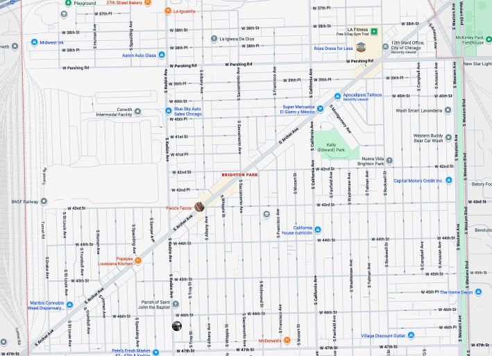 It makes sense that few drivers are actually using alleys to avoid construction on Archer in Brighton Park, because there aren't any alleys in the neighborhood that run parallel to the diagonal street for more than a couple of blocks.