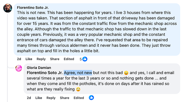 But in her Facebook video post, Damian mentions that the alley is not off Archer, stating, "This is what's happening in front of my garage everyday since Kedzie [emphasis added] turned into a one-lane street." So Terry was apparently confused when he chose to include her clip in his report about Archer.