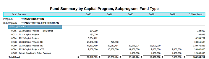 According to the City’s own 2025–2029 Capital Improvement Program bond tables, available bond funding for the Transit/Bicycle/Pedestrian Program falls dramatically over the life of the plan from approximately $69 million in earlier years to about $6 million by 2029. That represents a reduction of nearly 90 percent in bond funding for the program, based on figures published by the City’s budget office.