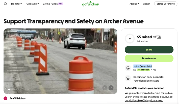 Again, Villalobos exhorts citizens to fight "proposals to reduce lanes on Archer Avenue," counterintuitively arguing that the plan to reduce speeding and crashes is bad for "public safety" and "environmental" needs. She asks people to chip in to help her fight City Hall. (Today, in the interest of goodwill, I donated $5 to buy Villalobos a cup of coffee, making me the first contributor in the three days the fundraising page has been up.)