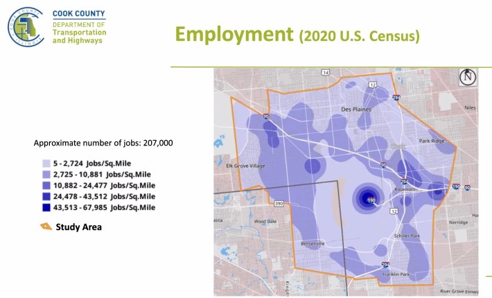 “You can see that suburban Cook County, elsewhere, actually has a bit higher transit use to get to work and a higher rate of biking to commute than our study area,” Thomas added. “So employment and getting to work are a big part of our study, because our study area has such a high level of employment. Again, according to US Census numbers, there are more jobs here than residents in the area, with about 207,000 jobs. A lot of these are, of course, from O’Hare International Airport itself.”