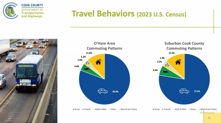 “Another important part of the attributes of residents of this county that we wanted to make sure we look at is the travel behaviors from the US Census,” said Jesse Thomas, a planner at the firm CDM Smith. “So these two pie charts show the difference between our study areas surrounding O’Hare and then suburban Cook County, which is Cook County minus the city of Chicago.”