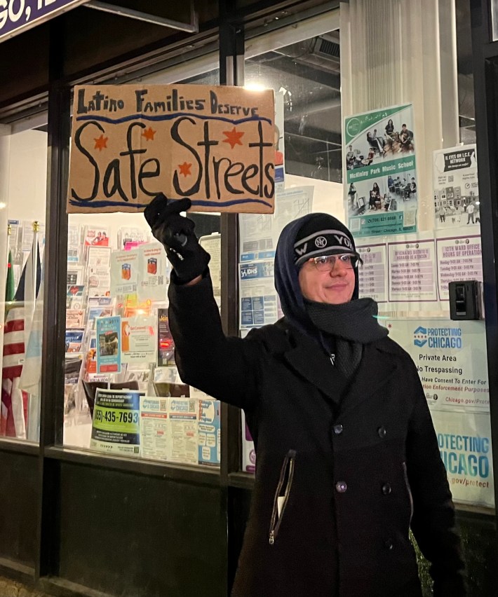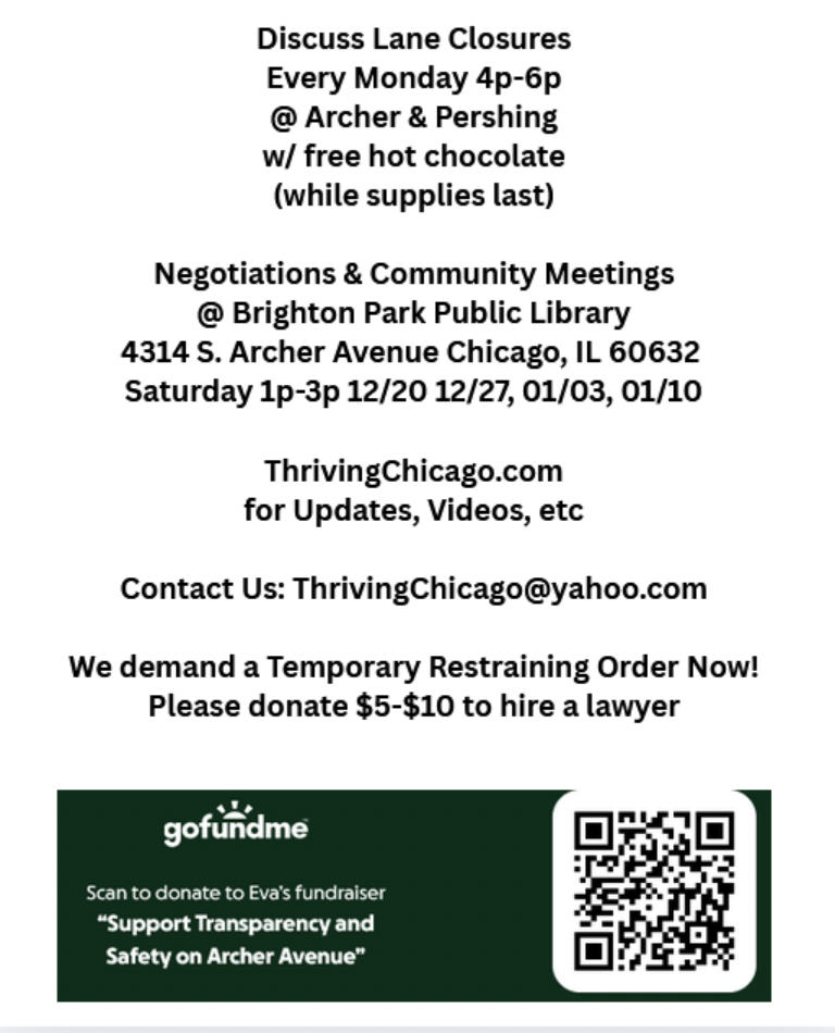 Before we move on to the interviews, I should mention a couple of new developments from last Monday’s rally. Villalobos and others were passing out new flyers for the “Archer Guardians” opposition group. In addition the weekly protests in front of Ramirez’s office, these mention four weekly “Negotiations & Community Meeting” gatherings on Saturdays from 1-3 p.m., starting on December 20. The handbill includes the QR to the aforementioned GoFundMe, plus the URL ThrivingChicago.com.