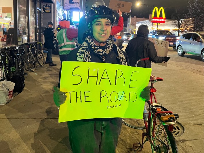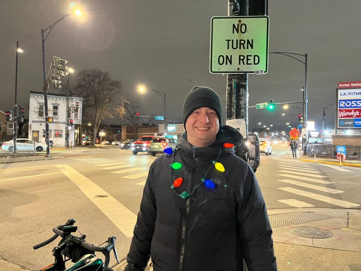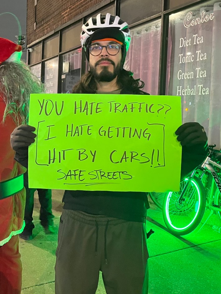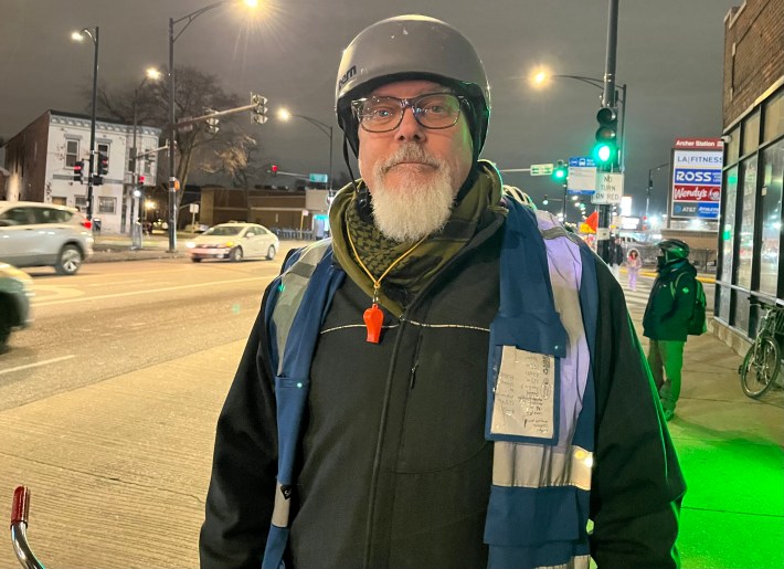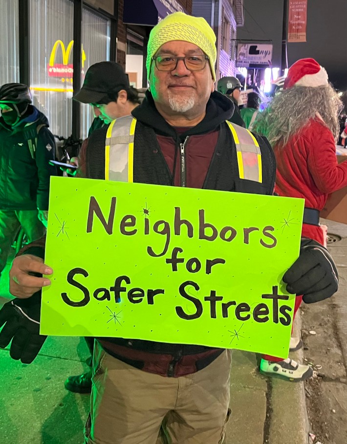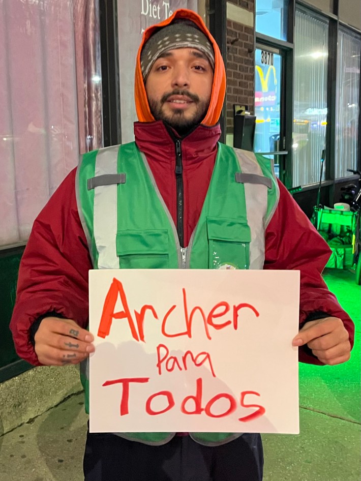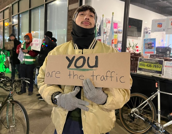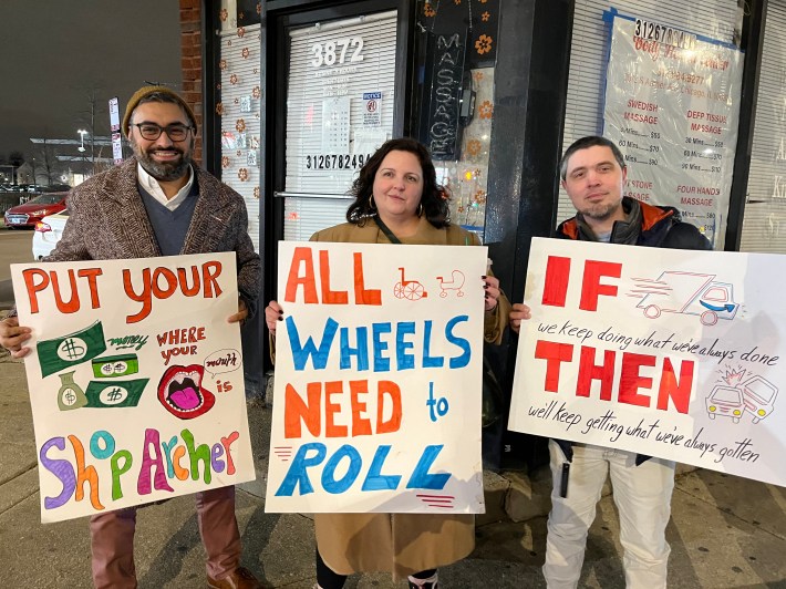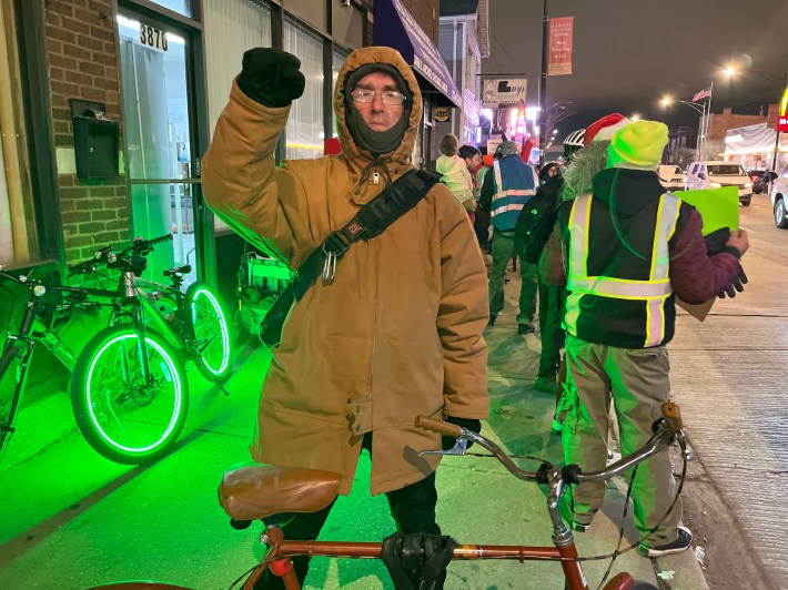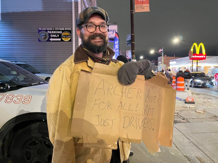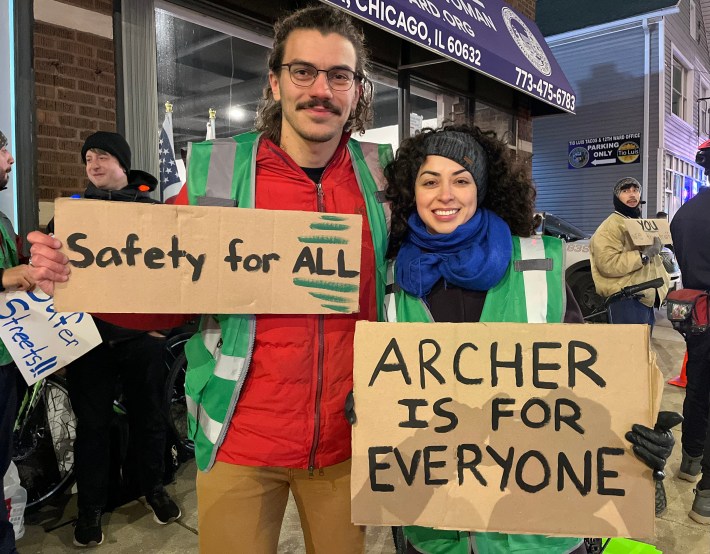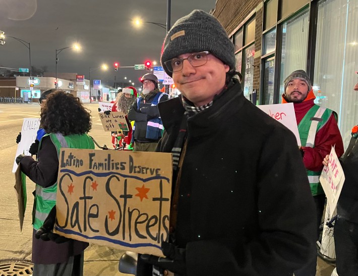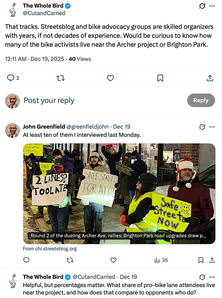 Fortunately, proponents of the Archer and Kedzie safety project have also been showing up for the last three weekly events to hold competing rallies. Possibly thanks in part to 23F temperature that might have scared off folks who mostly commute in heated cars, there were two or three times as many boosters as naysayers last week. Ten of them I interviewed said they have roots in Brighton Park or next-door neighborhoods, so they weren’t just sustainable transportation advocates parachuting in from the North Side. But one of my Twitter followers was still skeptical.