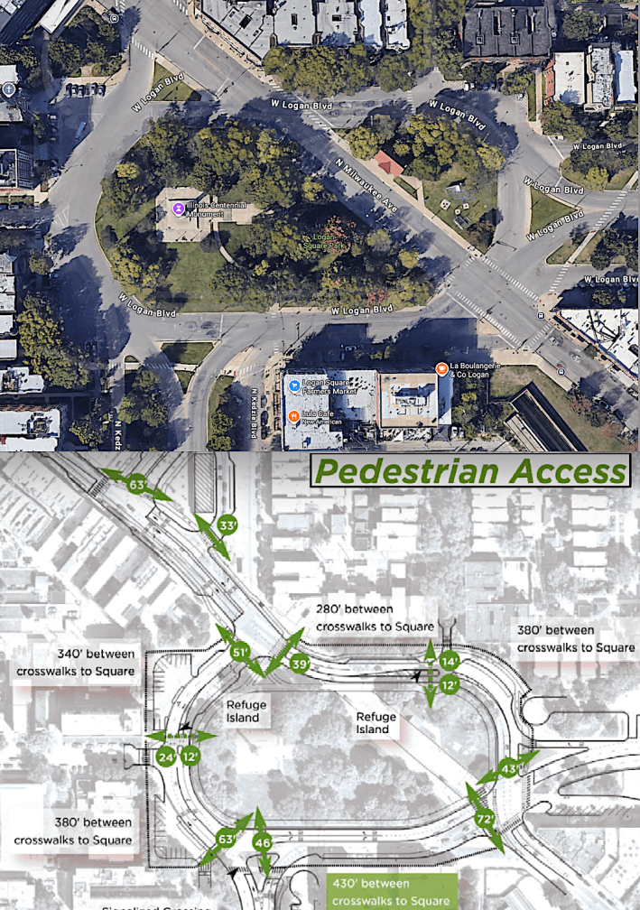 My friends longtime Logan Square residents and sustainable transportation advocates Julie Dworkin and Gin Kilgore joined me recently to walk and bike the perimeter of the circle. They both attended the project’s early public meetings.