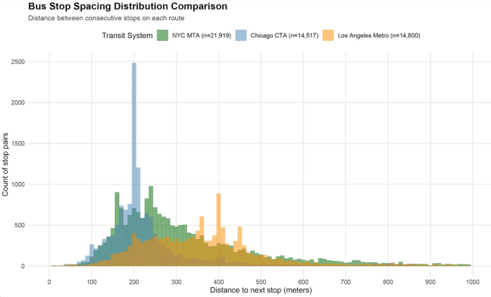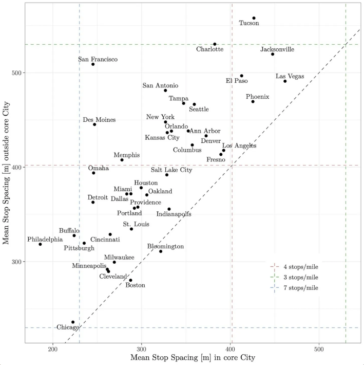 This hyper-local stop pattern is a good-faith effort to ensure that any given rider is no further than a five-to six-minute walk away from a bus stop, but every additional stop slows down the bus for every other rider on the line. It’s nice to have a bus stop right outside your door, but that bus is a lot less useful if it moves at a crawl thanks to ever-present stops which increase dwell time. It’s also at odds with national and international best practices. As Streetsblog contributor Richard Day highlighted a few weeks ago, Chicago has the most tightly-packed bus stations of any city in the country.