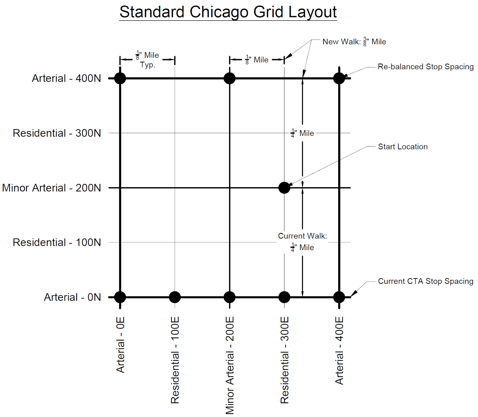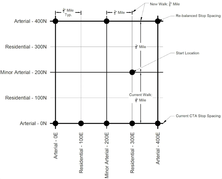 Most CTA buses fall into either local street or rapid street transit meaning they should be spaced between 1/8 and 1/3 mile apart. Local streets refer to routes like the 44, 50, and 96. Rapid streets are similar to the 49, 63, or 95. Currently, almost all routes utilize 1/8 mile spacing. This proposal increases all routes to between 1/4 and 1/3 mile. The only routes that already met this standard were the X4, X9, and X49. Even CTA’s neighborhood-to-neighborhood express routes like the 2, 6, and lakefront express buses use 1/8 mile spacing, which is sometimes as small as 1/16 mile. If the CTA decides to invest in bus rapid transit, not simultaneously adjusting stop spacing would bring it out of compliance with APTA recommendations and fail to realize its full potential.