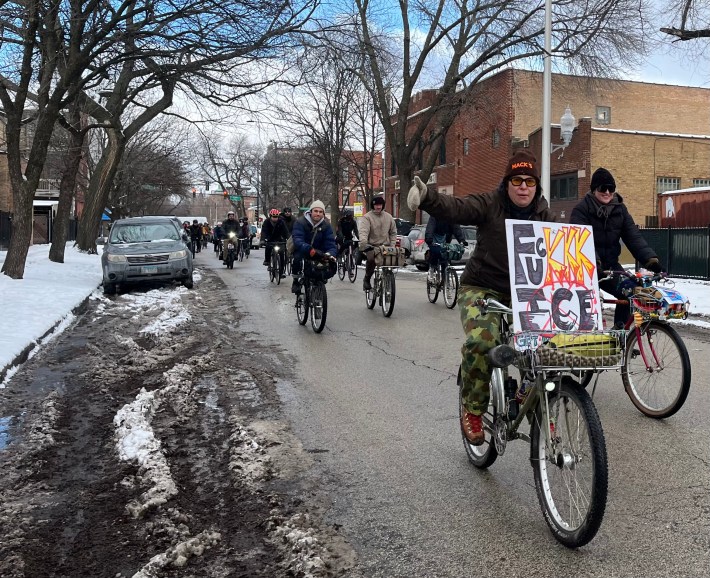 This afternoon, despite snow and temperatures in the 20s, perhaps hundreds of Chicagoans took to the streets for a bicycle parade honoring Alex Pretti. A week ago, the 37-year-old VA nurse was shot to death by federal agents in conjuction with Trump’s Operation Metro Surge immigration crackdown in Minneapolis.