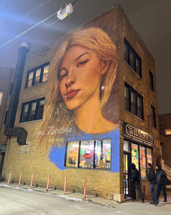 Saturday night, as I cycled from SBCHQ in Uptown to the the Logan Square opening I passed by a controversial new sustainable transportation-related artwork. The mural, at the southwest corner of Montrose and Western Avenues in North Center, depicts Iryna Zarutska, 23, a Ukrainian refugee who was randomly stabbed to death while riding light rail in North Carolina.