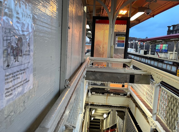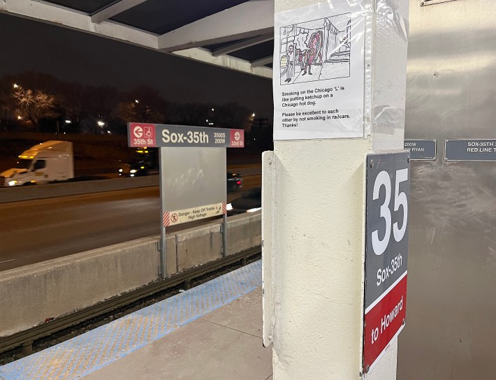 (OK, let’s get this part over with.) Now, I realize that some Streetsblog readers may feel this is my wurst idea ever. Maybe you think that me traveling to just about every Red Line station from Roseland to Rogers Park to tape up these signs is just an example of hotdogging. But hopefully after reviewing the images from my quest, you’ll be convinced that this initiative really cuts the mustard. (Feel free to add your own SFW hot dog jokes in the comment section.)