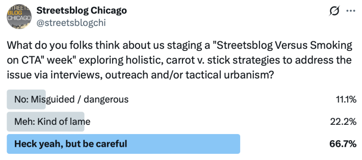 This is the third episode of our series “Streetsblog Chicago versus smoking on the CTA.” It’s an attempt to to find holistic solutions (not just additional enforcement) to the frustrating issue of smoking and vaping within ‘L’ carriages. Check out part one to get a sense of where I’m coming from on this topic. Many of us know that smoking in enclosed spaces is a big problem for those with lung conditions, elderly folks, and young children. And second-hand smoke is harmful and irritating to others as well, and it discourages people from riding public transportation.