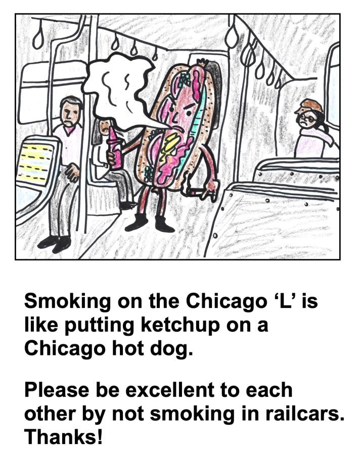 And maybe this stunt will inspire the agency to use additional (ideally funny) tactics to remind riders of the Golden Rule. “More signage and announcements about the smoking policy would be helpful,” American Lung Association’s Illinois Director of Advocacy Kristina Hamilton recently told me.
