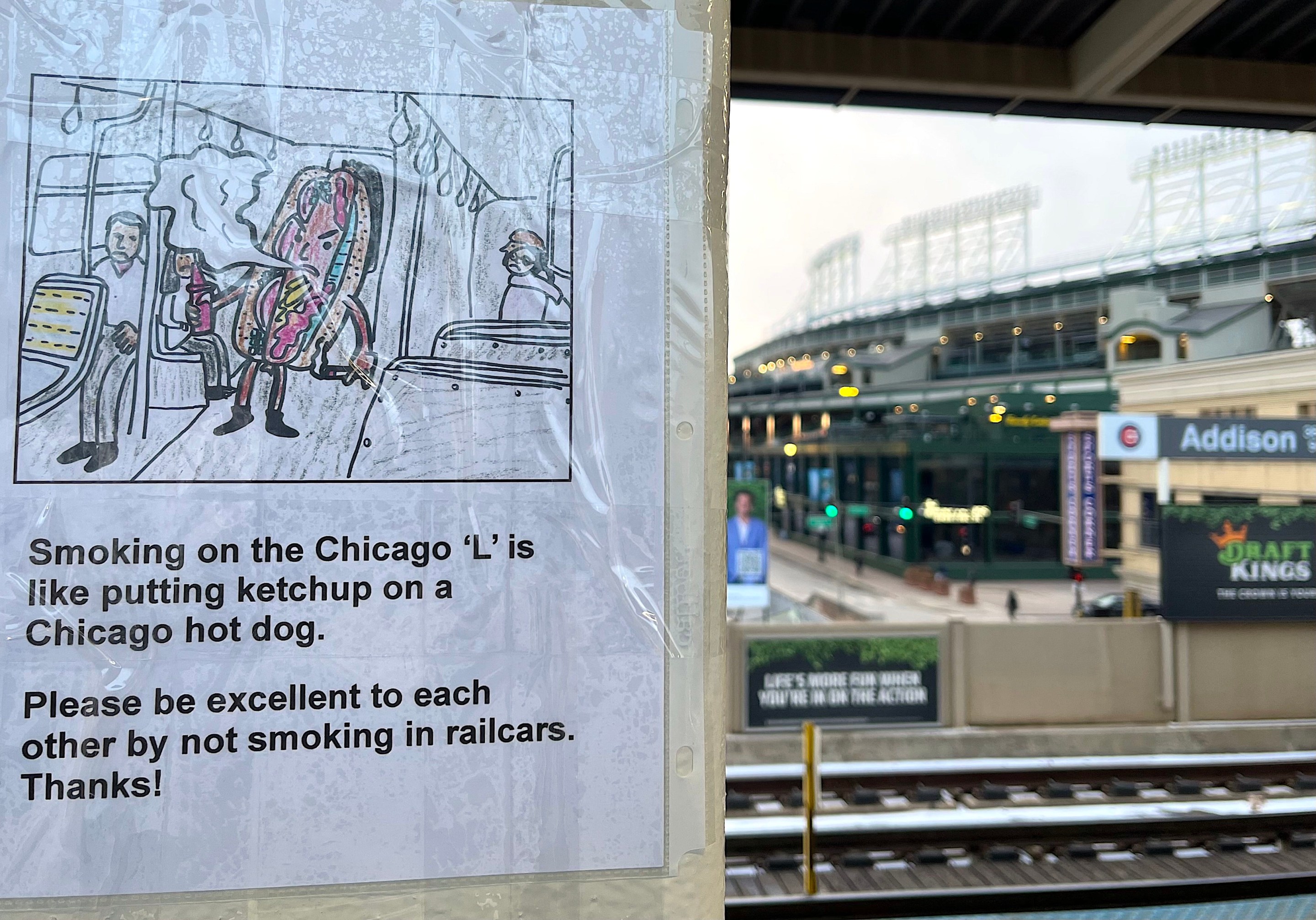 And maybe this stunt will inspire the agency to use additional (ideally funny) tactics to remind riders of the Golden Rule. "More signage and announcements about the smoking policy would be helpful," American Lung Association's Illinois Director of Advocacy Kristina Hamilton recently told me.