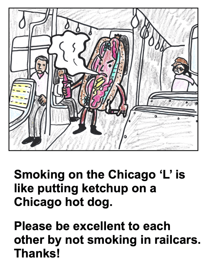 I realize that my posters alone may not persuade all that many folks not to puff around other passengers. But the main goal here is to spark more conversation about what more could be done to create a culture on the CTA where almost everyone avoids smoking inside railcars, as a courtesy to others.