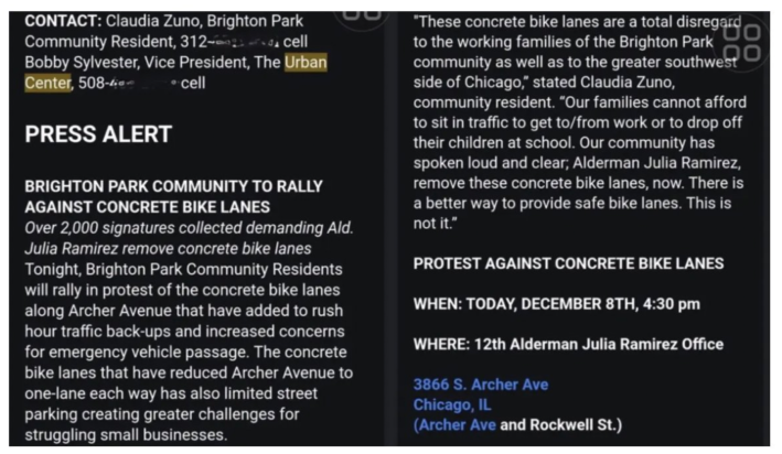Zuno definitely knew people from the Urban Center by then. On the press release the group put out for the December 8 Archer protest, held the week before our conversation, she was listed as a contact and quoted calling out Ald. Ramirez.