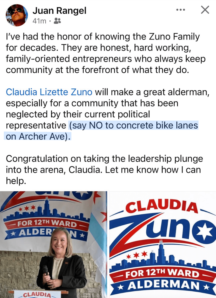 As I bicycled to the 'L' after attending last Monday's [checks notes] round ten of the dueling rallies against and for the Archer Safe Streets project, it occurred to me that I had an unpublished interview from one of the December events. During my video conversation with opponent Claudia Zuno, a photography studio owner, I asked her about the rumor I'd heard that she was planning on running for alder against local representative Ald. Julia Ramirez (12th).