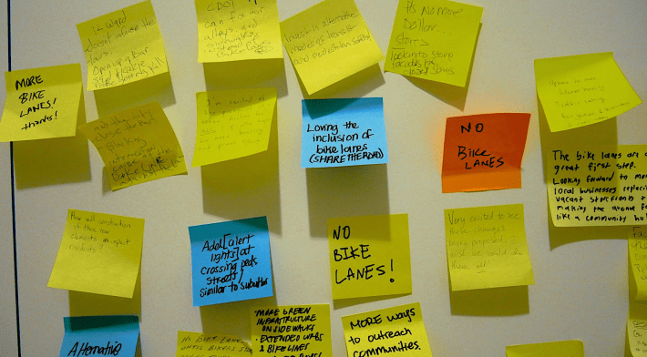 Many sticky notes also expressed opposition towards allowing more drive-throughs in general, preferring local businesses with traditional storefront access.