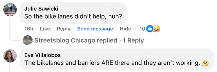 Perversely, Archer project opponents argued on Facebook that this latest scary incident is evidence that protected bike lanes don't actually protect people. These included real estate agent Julie Sawicki and protest co-organizer Eva Villalobos, a former pro-charter school CPS board candidate whose campaign received tens of thousands of dollars from Urban Center.