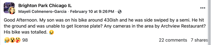 Last month there was more evidence of the need to make Archer safer. On Tuesday, February 10, Mayeli Colmenero-Garcia posted the following on a Brighton Park Facebook discussion group.