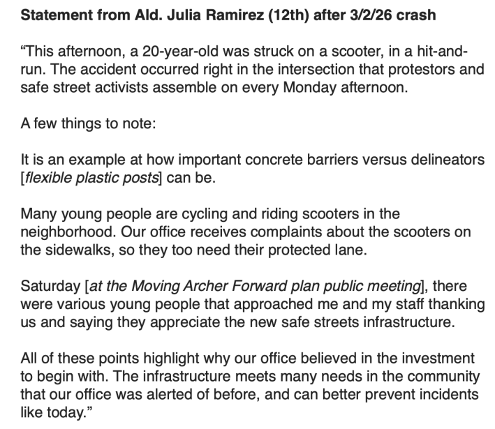 But there's a tragic irony to the opponents holding their weekly protests against a Safe Streets project at that location. In February 2024, just to the west of the 12th Ward office at the six-way intersection of Archer, Pershing, and Rockwell avenues, the speeding driver of a large vehicle struck and killed a pedestrian in a crosswalk. Streetsblog is working on getting more details about what happened.
