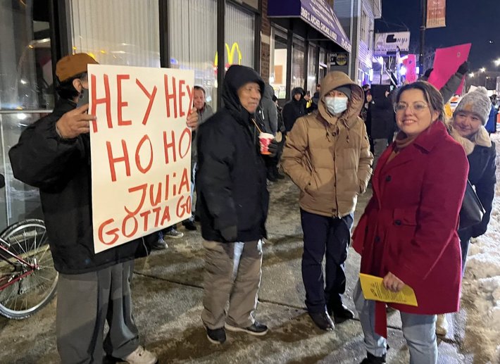 "We have businesses who are being harassed." This probably refers to Archer project supporters who reportedly politely asked merchants to take down the "2 Lanes Not One" signs the opponents gave them. "And yet who is advocating for them. Not our alderwoman. She's just there to say yes to what the mayor wants. And we're tired and done with it. We want to stop this. And it starts with you."