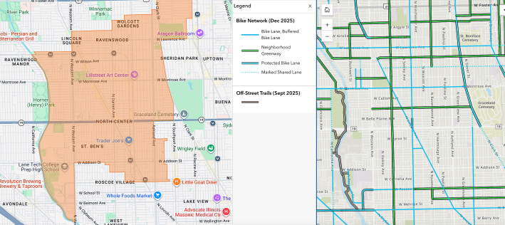 We also have a protected bike lane that runs on Roscoe and Campbell, west of Western connecting to the Belmont protected bike lane. And there's small sections of protected bike lane that are being built, the Leland Greenway portion, some intersections at Lincoln Avenue and Montrose [and Leavitt Street]; at Lincoln, Damen Avenue, and Irving Park; and at Leland and Western.
