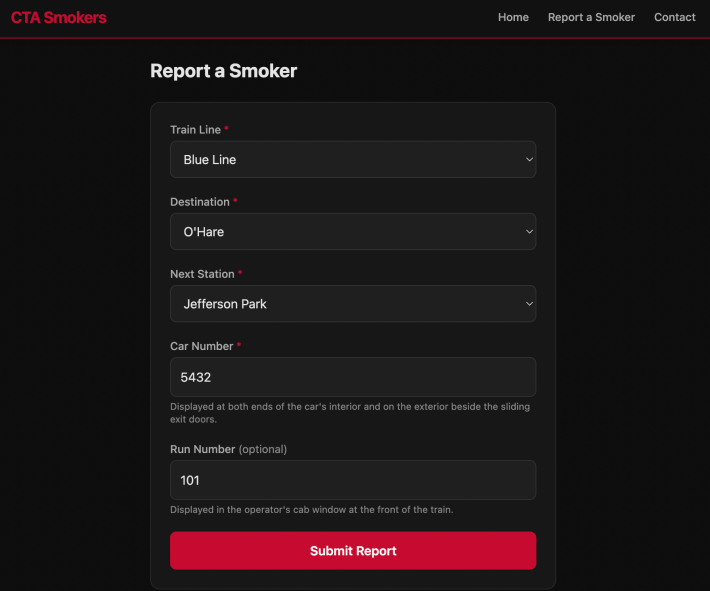Meanwhile, software engineer and regular CTA rider Logan Kulinski is trying to address the issue. He built the CTA Smokers website as a crowd-sourced, real-time tracker of which railcars have smokers. Anyone can submit reports, and they can to report the line, which direction the train is traveling in, the next station the train is approaching at the time of the report, and the railcar number (which is written at the end of each railcar). The reports then show up live on the front page.