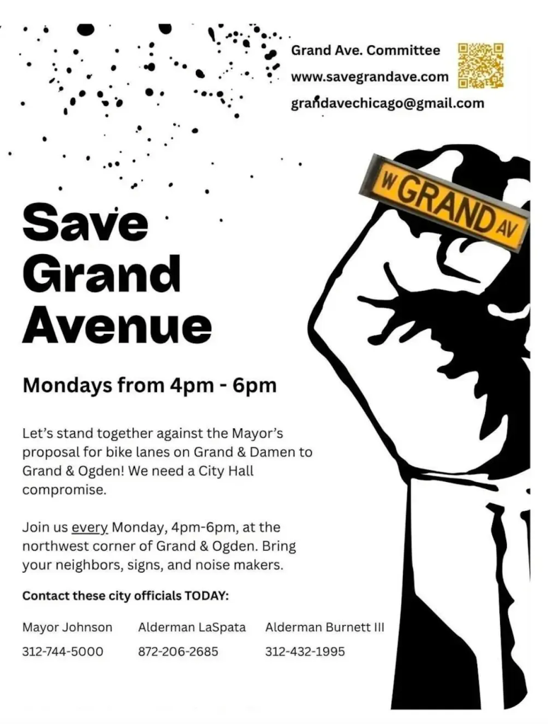Here’s some more news about organized protests against Complete Streets initiatives taking place every Mondays from 4-6 p.m. Yesterday I wrote that “The effort to block the Grand Avenue traffic safety project, between Damen and Ogden Avenues in West Town, appears to have come to the end of the road.” But I may have spoken too soon. Today someone shared this new flyer, which I’m guessing was created by Grand Avenue Committee ringleader Roger Romanelli, a longtime anti-sustainable transportation activist who lives in suburban Hillside. Probably not coincidentally, Archer opponent Villalobos has attended at least one of the Grand opponents meetings.