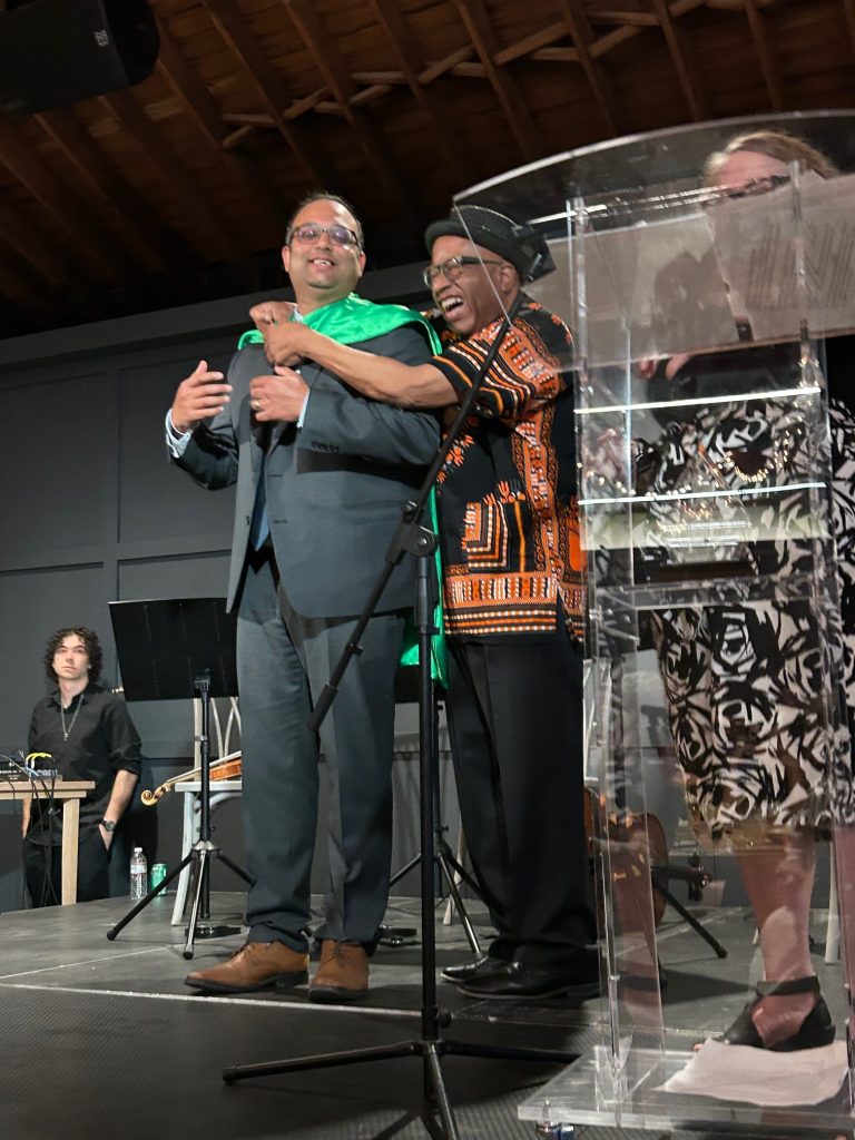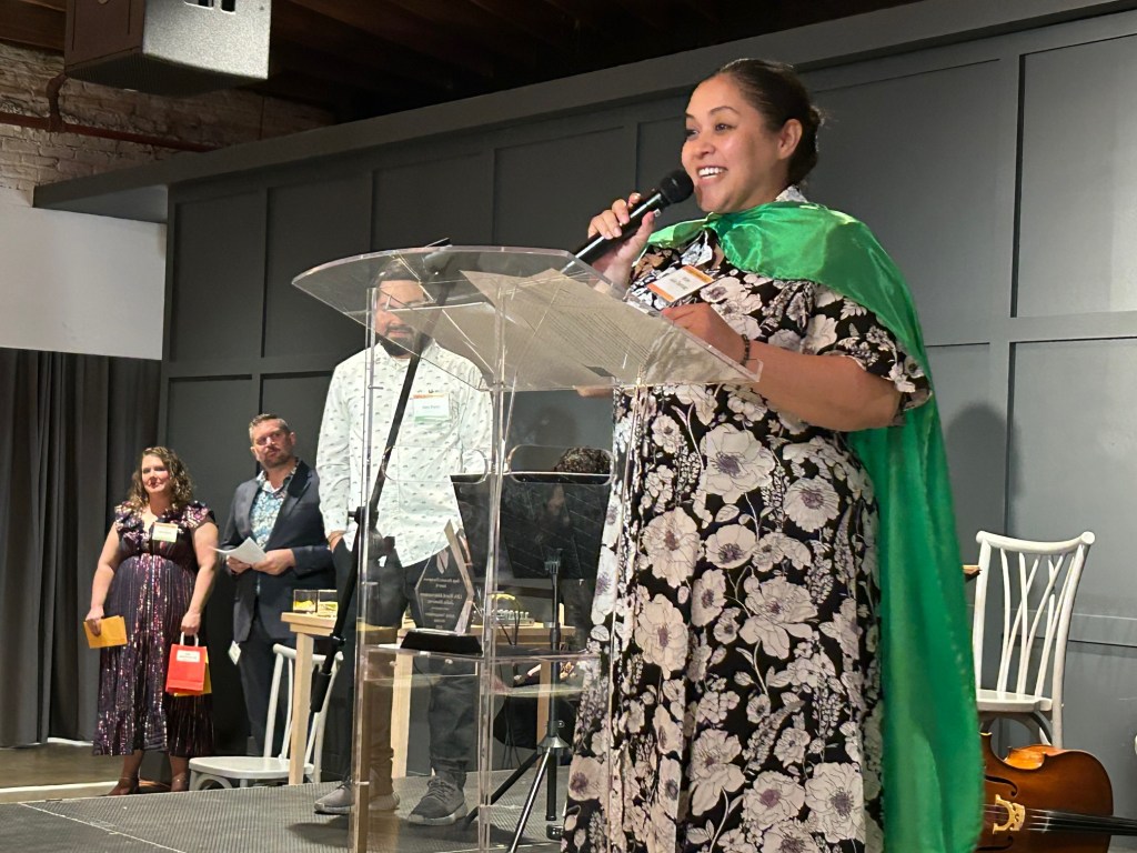 Next, Schultz place a cape on Delgado’s shoulders. She applauded the work of ATA and community advocates. “When you see the effects of this bill, which will go into an effect in a month… you’ll know it’s worth it,” she said. “When you see that bus, you can say, ‘I did that.’ When you see those trains coming every ten minutes, you can say, ‘I did that.'”